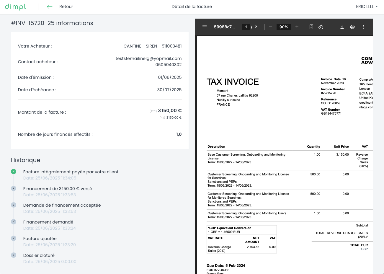 Financées – payées par Dimpl, en attente de règlement par votre client