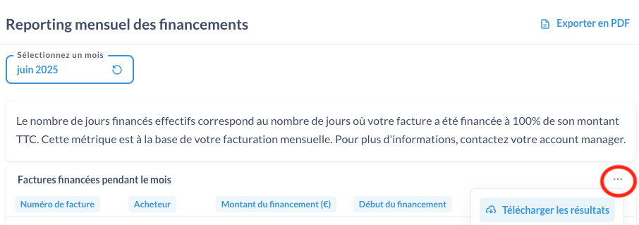 Onglet Reporting : vue mensuelle de tous vos financements (montant, jours financés, paiements reçus).